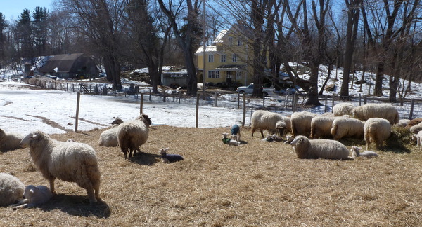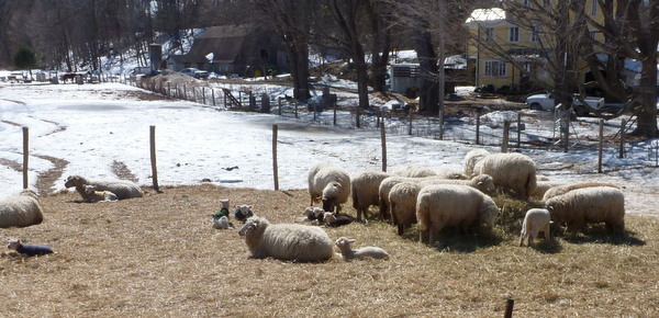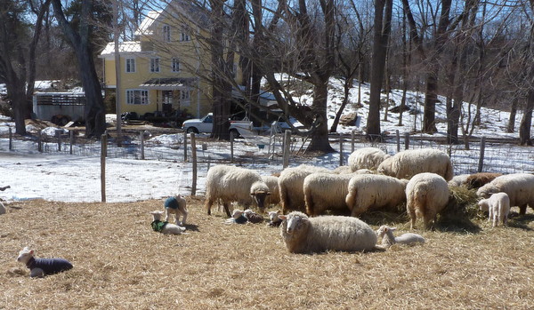 I was just looking at these photos I took last February, and thought it would be fun to post them. Driving by a farm near our house in Claverack, we saw a flock of sheep, with their babies, in a pen right by the road. It was very early in the year for them to have been born, but there they were. So, to keep them cozy, each one had a sweater on, in several fashion colors.