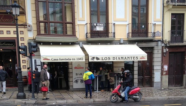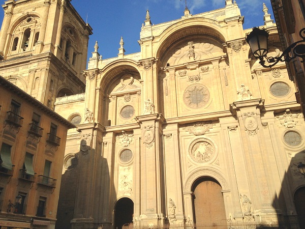 We awoke to a steady rain in Benalmadena, so we did not rush to depart, and lingered with Cathy over a breakfast of toast and coffee. We arrived in Granada after a rainy drive from Benalmadena. Our first thought had been to go directly to the hotel, drop our bags, and then find the train station to return the car. Our meanderings, however, led almost directly to the train station, so the plans were changed and we dropped the car and took a taxi to the hotel, letting the taxi driver find our way. A much better plan. We checked into the Hotel Plaza Nueva, and went across the street for a tapas lunch standing at the bar at Los Diamantes, which is known for seafood, mostly fried. With each round of wine we were given a free tapa, first shrimp and then mushrooms. We also ordered 2 half-raciones, razor clams and chicken nuggets. It’s good food, the place is very crowded, and service is fast. I would not choose it for dinner, but for lunch it works out nicely.