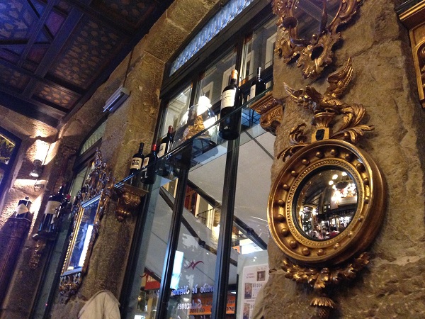 The restaurant was busy and lively, with a charming atmosphere, the food, though fairly traditional, was delicious, and the menu quite varied. We had burrata with sardines and tomato salsa, grilled octopus, baby lamb chops and presa Iberica, all prepared with skill and care. For dessert we had a “special cake” that I can only describe as a Spanish version of Martha Washington cake. With a bottle of Fontenei tinto 2010 and water, the total was 113 euros.