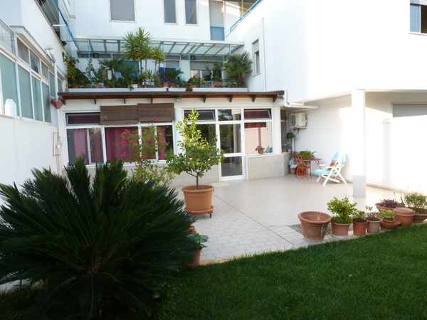 Then we headed off in our car with Marcello to Alberobello, encountering a few hairpin mountain roads on our way up into the lush hills and valleys, heavily endowed with trulli of all shapes and dimensions. These houses are unique to Puglia. Marcello seemed to confirm the tales we had read about the purpose of the conical roofs built without mortar: that they allowed the owners to take down their roofs before the tax collector showed up, thereby escaping tax on what was a non-house without a roof. Strange that the tax collectors never caught on to the ploy. Whatever their origins, the trulli are truly abundant in Alberobello, which is among the most beautiful towns in Italy. We found our way to Pina’s charming one bedroom apartment with a delightful patio and garden area. We had coffee and chatted, in translation. Pina is also a very accomplished amateur artist, the walls being copiously adorned with her works. Pina then took us in her car, since she has access rights to certain restricted areas, and we explored the heart of the trulli district, heavily endowed with t-shirt and ice-cream emporiums, but still quite impressive. As we parked, we spotted an elderly crone sitting in the sun happily knitting, and after Marcello attempted to take her picture, she withdrew in indignation back to her station as the madame des toilettes. In time we met up with Patrizia and Marilena at the small but charming cantina located on the Worth Avenue of Alberobello. The kitchen was open to the few tables, and the staff prepared lunch just like Nonni. I was a bit taken aback by the quick dispatch of dishes and silverware after each course, until Stanley explained, from his perspective looking into the kitchen, that they were furiously washing after each course to make sure there were enough plates and spoons.