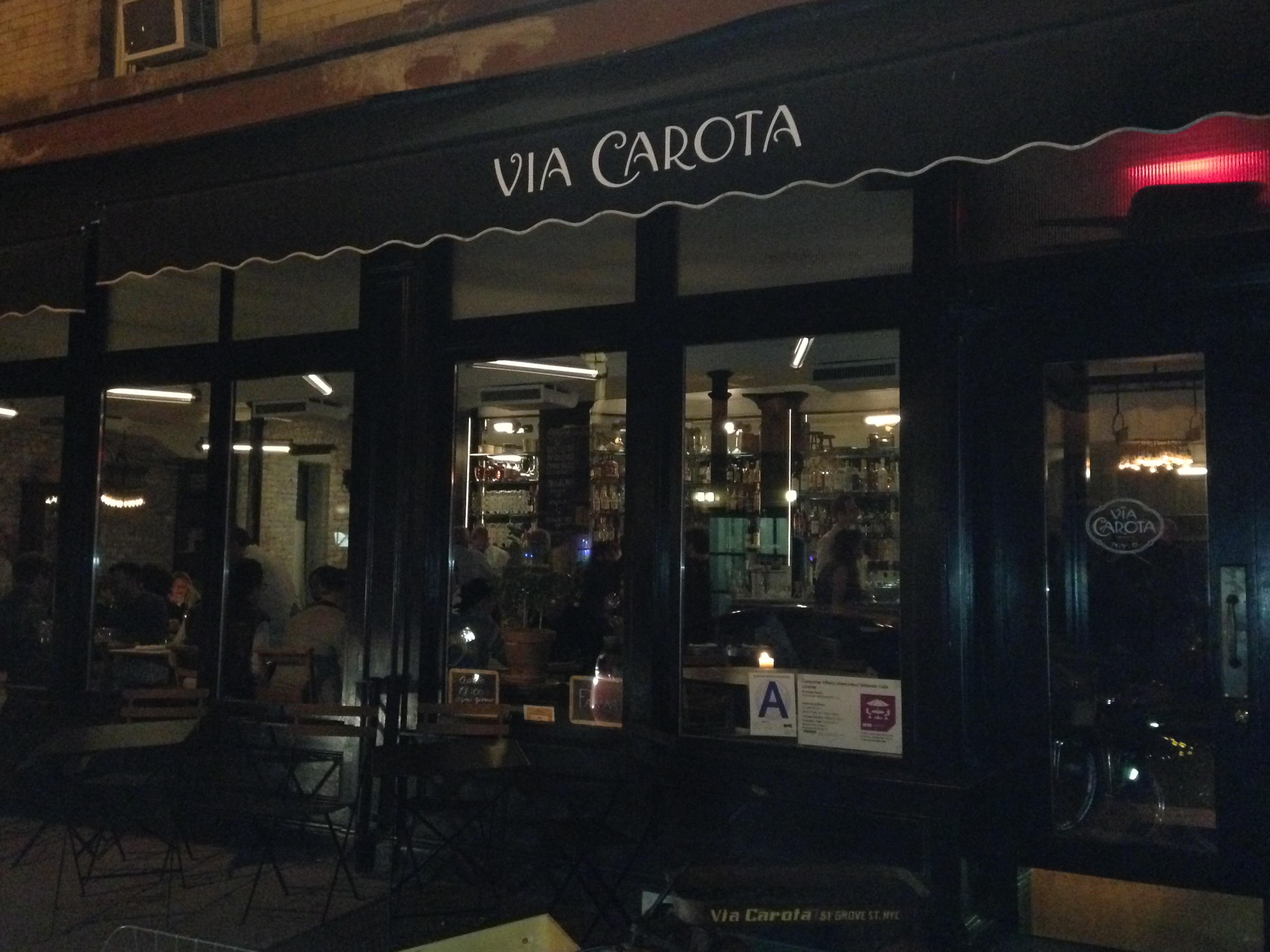 I’d read good things on Chowhound and elsewhere about Via Carota, the fairly new Italian restaurant on Grove Street in the West Village, but given that they don’t take reservations and we are highly averse to long waits, I wrote it off. Last night we were thinking about where to have dinner, and being a Monday I found several of the places I had in mind were closed. We thought Lederhosen was open on Mondays and headed over there. Though they do not take reservations either, it is not difficult to get in. Unfortunaely, though the sign on the door indicates they are open on Monday, it was shut tight.