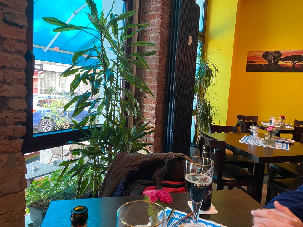 We had a very nice lunch at Elefant, around the corner from the hotel. The food is traditional German, with a huge selection of schnitzels and other standards. Stanley had veal schnitzel with mushrooms and onions, accompanied by home fries and a salad, while I had beef roulade with red cabbage and very good potato dumplings. We really enjoyed the food. We had a couple of bottles of Kostritzer black beer. Service was cordial and efficient. The bill with tip totaled just over 50 euros.