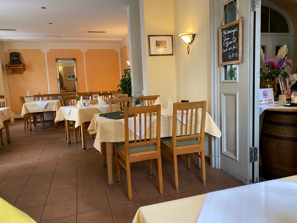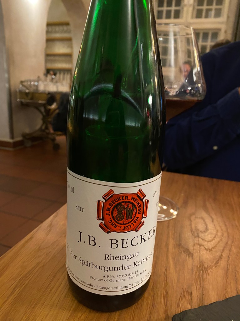 We had a bottle of Wallufer Spatburgunder from the Reingau, very well priced at 45 euros, and with dessert, glasses of sweet riesling.