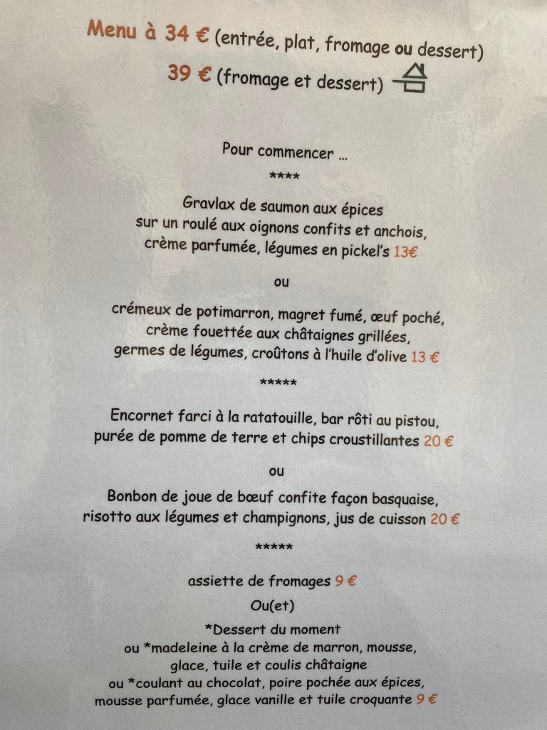 Everything was very good, but there is no printed menu and everyone gets the same dishes. This place seems a bit too serious for its own good. The 58 euro menu includes two starters, a main dish and two desserts. Everything they served us was fish or seafood, i.e. shrimp, squid and trout. With a 32 euro bottle of Ardeche wine, and water, the bill was 173.