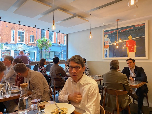 The menu offers a lot of choice and is not terribly expensive. Stanley started with a dressed crab, and I with a crispy duck salad. Main courses were salmon and roasted monkfish, both very nicely prepared. Wines are prices but I found a very good Cotes du Rhone for 45 GBP.
