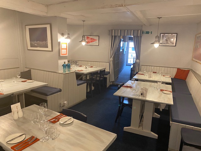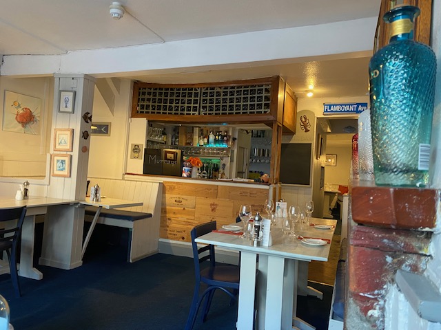 We ordered from the catch of the day menu. I started with 6 oysters, which were huge and delicious, very similar to the Pemaquids we have on our trips to Maine. Stanley had mussels in a garlic cream sauce, which were very plump and fresh. For the main courses, I had a whole plaice and he had bream with samphire. They were both extremely fresh and full of flavor. With a nice bottle of pinot grigio rose and 2 coffees, and tip, the total was 105 GBP. We were very surprised to be only one of two tables for lunch, while some other nearby restaurants were very busy. This is a gem, hidden in plain sight.